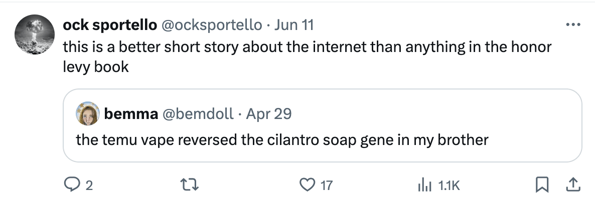 Insofar as Levy has attained, well, both generational and locational micro-celebrity, it’s neither surprising nor some profound event that snippets (or, rather, a snippet from the first page) of her book were mocked with a commitment and intensity that suggest more than just a distaste for meme-heavy writing. I partook in this mockery, and I don’t particularly regret it. But the conversation around Levy’s writing began to resemble that surrounding another literary it-girl, Lauren Oyler, earlier this year. In both occasions, one paragraph made the rounds, becoming the hinge point of every brutal takedown, every dismissive tweet, every rejection of literary merit. The unfortunate aspect of each round of consensus mockery is that both paragraphs were, quite evidently, jokes, and that parsing whether they were effective or worth eviscerating required opening the books within which they were made.