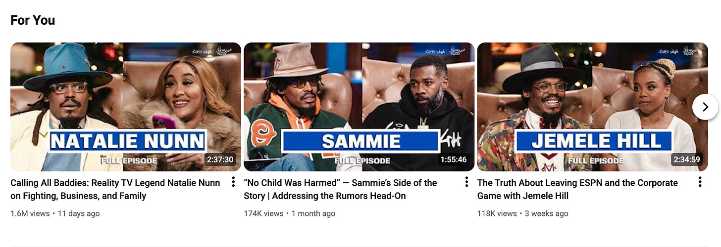 Don’t need to belabor the point, but, wow. Newton’s social intern is a three-level scorer. From thumbnail to thumbnail, you get everything: the breathless gravity of “Natalie Nunn: Don’t Speak On My Family” (accompanied by the thumbnail’s slight elaboration, “Don’t Ever In Your Life Speak On My Family”), the honeypot-style “Natalie Nunn Explains What A Real Baddie Is,” and the series of utterly brilliant Jemele Hill-centric thumbnails “Did I Fumble Her? Perhaps I Did,” and “They Told Me To Take The Obama Photo Down.” A lot of the grousing about AI in culture misses the point, in my opinion. I’m not scared that artificial intelligence will replace, like, the people who made Marty Supreme—I’m scared that it will replace the person who put such deliberate care into these thumbnails. This is what it’s all about. There also appears to be a recent full-length episode with Jussie Smollett that I’m just not touching here, but go check it out for yourself.