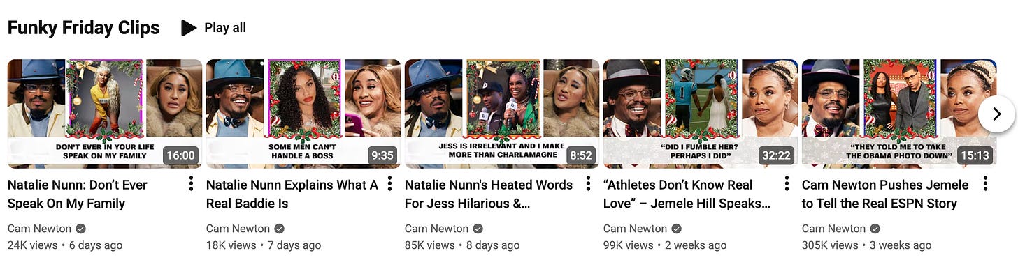 So, first, some groundwork. “4th & 1” is but one of at least two Cam Newton video podcast properties. Where “4th & 1” appears to center around sports discussion—specifically, if its viral clips are any indication, discussion of young football players’ shortcomings—his other project, “Funky Friday,” merits some discussion as well. “Funky Friday,” an apparently pop culture-centric video podcast, appears to get 6-to-7-digit views on each of its expertly-titled clips. My preliminary scan of Newton’s YouTube account just now reveals genuine innovations in the clickbait-titling sphere.
